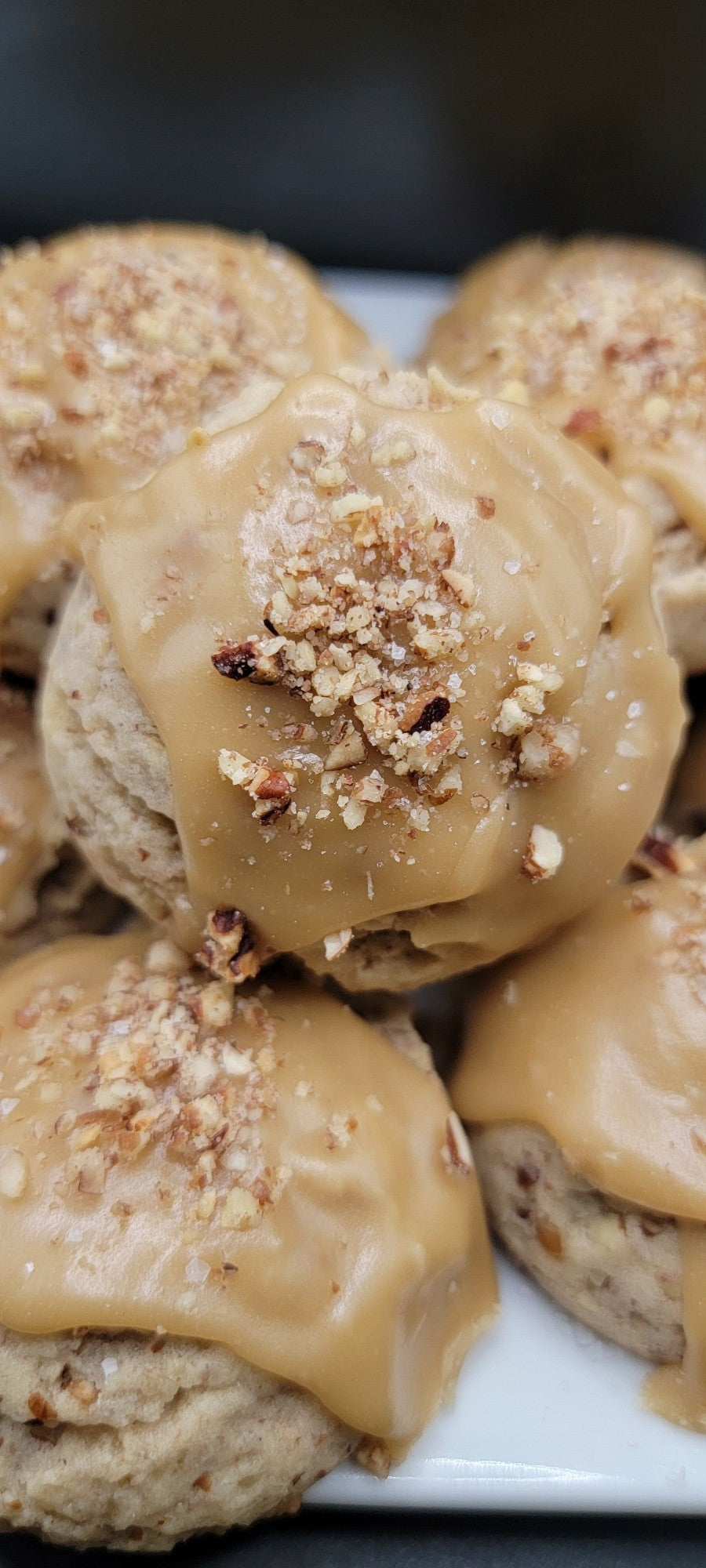 Our Pecan Praline Cookies are thick and buttery, packed with toasted pecans for a rich nutty flavor. Topped with sweet praline, extra pecans, and a hint of flaky sea salt, they deliver an irresistible blend of sweet and salty in every bite.